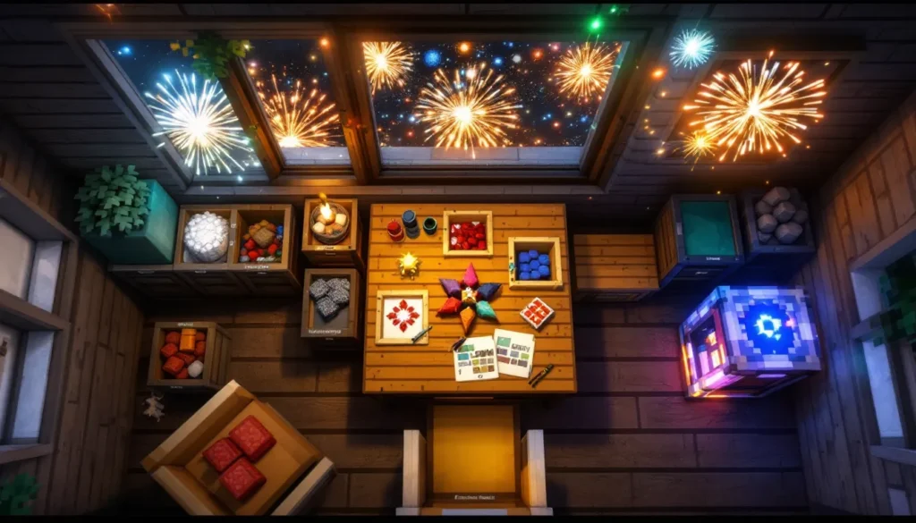 Most firework problems come down to running out of materials mid-display or not planning the sequence carefully. Build your farm first, craft your stars second, assemble fireworks third. This order prevents frustration.